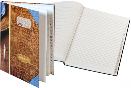 Registre A4, legate, coperta carton rigid. Variantele de coperti pot fi cu modele colorate sau simple. Foile sunt indexate A-Z.